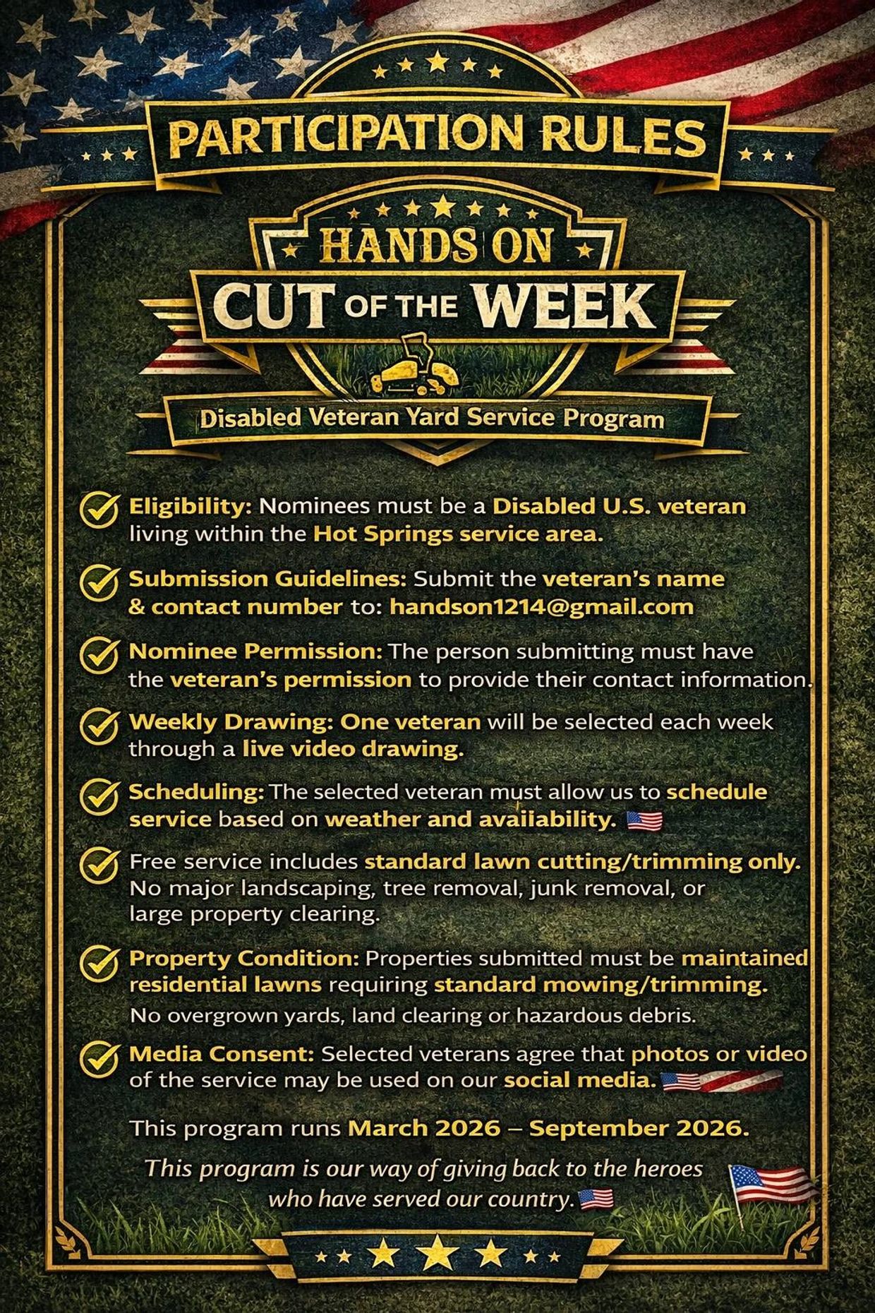 · The selected veteran must allow our team to schedule service based on weather and availability.